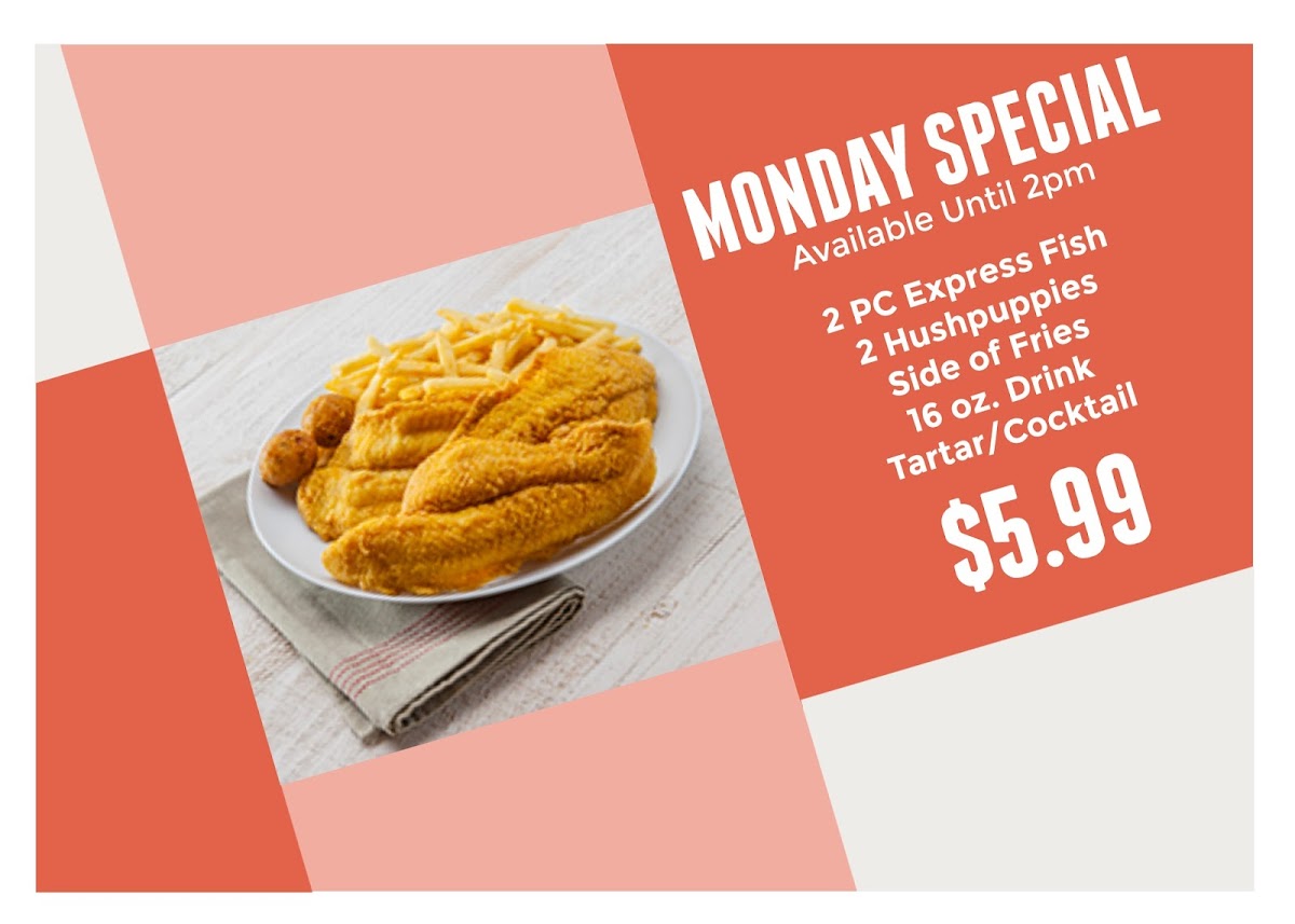 3 Pieces Express Fish Filets with a Regular Side and 32oz Drink. You can upgrade either for a little more. 466-956 CAL
